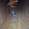 Après une brève promenade au soleil, entre champs et forêt, la progression dans le Gouffre du Biolet est initiée à 10h50. Le premier puits (P14) est équipé d'échelles et d'une corde de rappel. La descente est étroite, une première rhinolophe est constatée dès les premiers mètres de descente ; une attention particulière lui est apportée pour éviter de la bousculer en progressant. Les puits s'enchaînent (P10, P7, P6, P14, P4), et il est possible de systématiquement stocker environ 6 personnes en bas de chacun. A noter que le rappel dans le P6, en monopoint, a été doublé par sécurité avec le matériel emmené par le club. Les autres puits sont franchis sans difficultés. Au bas du plus grand puits franchi ce jour (P15), l'équipe prend quelques instants en cette imposante galerie avant de prendre la direction du sud.