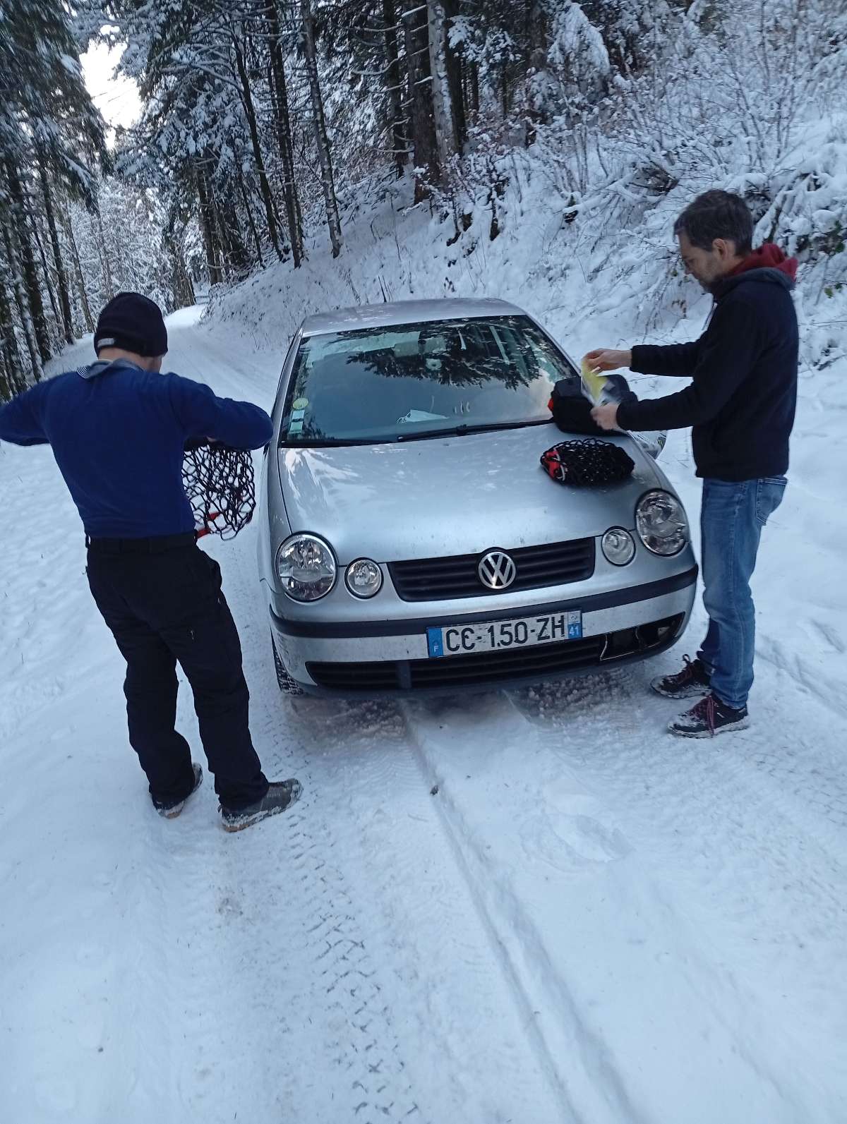 Sortie du dimanche avec Johnathan et Guillaume. À la base on voulait remonter la diau mais la météo étant pas favorable on a cherché un plan B. Guillaume propose entre autres le gouffre machin loups et comme j'en avais aussi entendu parler on se fixe là-dessus. Vu que Jonathan devait rentrer tôt à Lyon, on décide de partir assez tôt. Du coup au retour de la sortie de la veille je retrouve Guillaume au local et on fait les kits en réutilisant les cordes possibles. Donc tout est prêt le soir et on se retrouve le lendemain à 7h au local. On charge assez vite les voitures du coup et on part. On savait qu'il y avait de la neige, donc on était avec la voiture de Johnathan qui avait des pneus neige. On avance bien même si on va tout doucement. À un moment la voiture a du mal et on n’arrive plus à monter. On fait marche arrière pour reprendre de l'élan mais on commence à glisser sur le côté et la voiture freine plus trop bien. On arrive à la stabiliser et on se dit que c'est le moment de mettre les chaînes (qu'on avait !). On galère pas mal à les mettre mais au bout d'un moment elles sont mises et la voiture repart calmement.