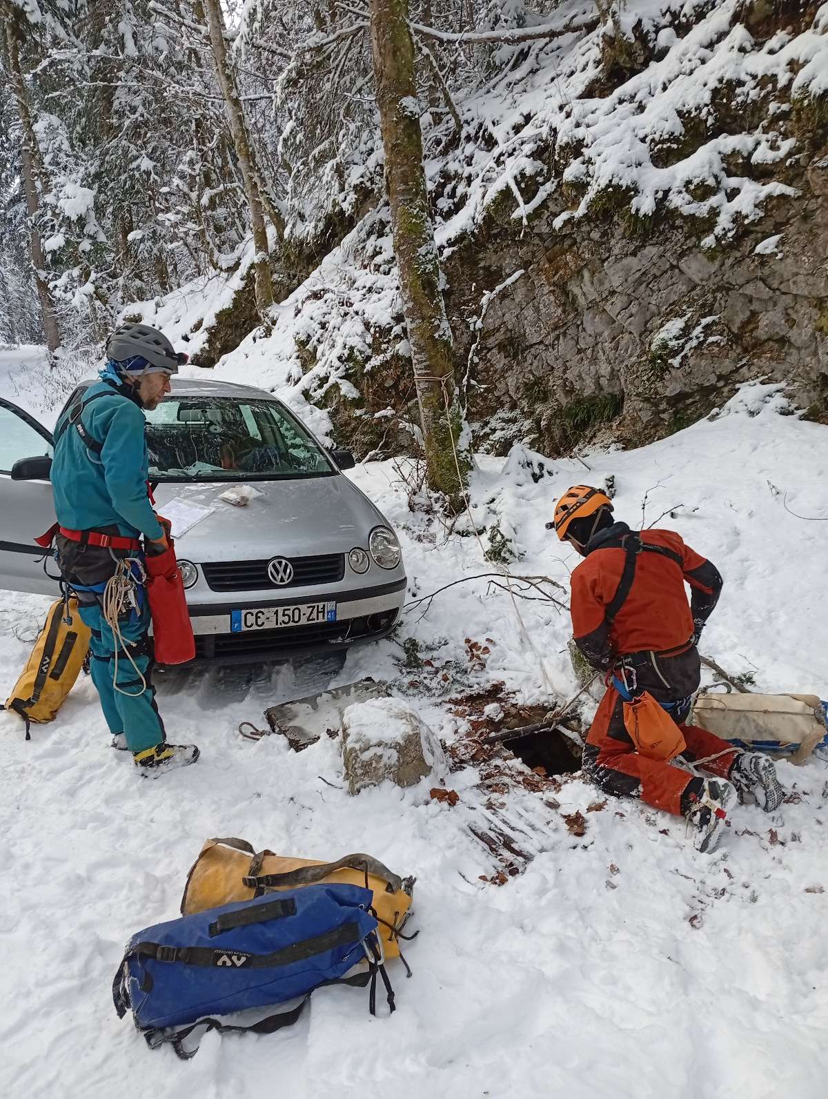 On finit par arriver sur le trou comme indiqué sur le GPS. On voit juste un gros caillou et de la neige et on se dit que ça doit être là. En effet c'est là. On s'équipe, il fait froid mais ça passe encore et on installe la barre à mine avec les cailloux et la corde sur l'arbre avant de se lancer dedans.