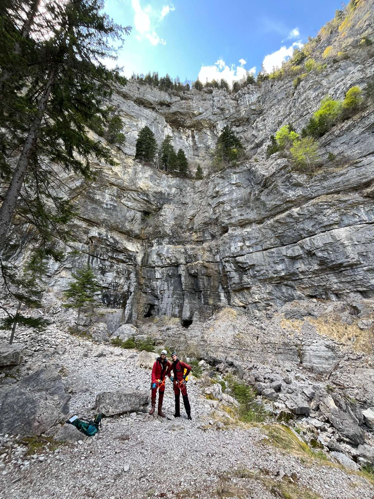 Nous arrivons au parking situé en fonds de vallée un peu avant 10 h et décidons de nous équiper directement de nos néoprènes avant de prendre le chemin vers le porche d'entrée que nous atteignons après 30 min de marche sur un agréable sentier. La vue est grandiose : une immense série de falaises que l'on devine monter jusqu'au plateau du Parmelan percée à sa base d’une multitude de galeries qui donnent probablement toutes accès à la Diau. La plus grande, un vaste porche plus large que haut consiste l’entrée principale ainsi que la résurgence de la rivière souterraine.